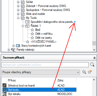 - Přetáhněte příkaz z podokna Seznam příkazů do uzlu Spouštění dialogu panelu u panelu.