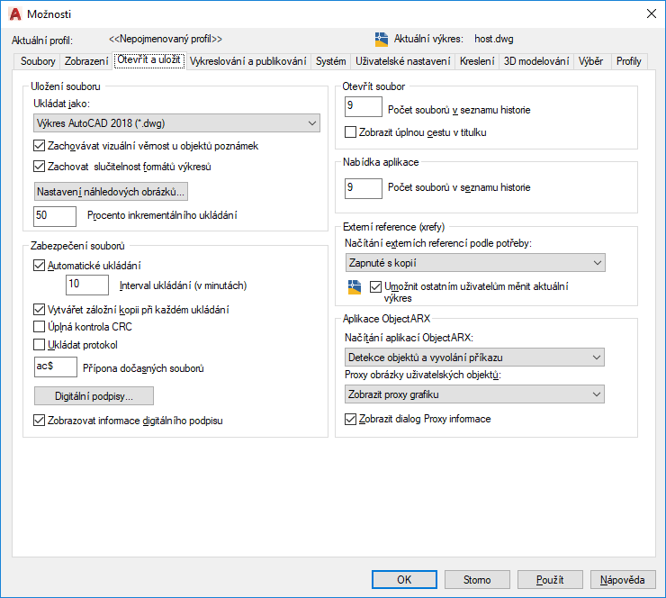 Interval ukládání (v minutách): Je-li volba automatického ukládání zapnuta, určuje, jak často bude výkres ukládán.