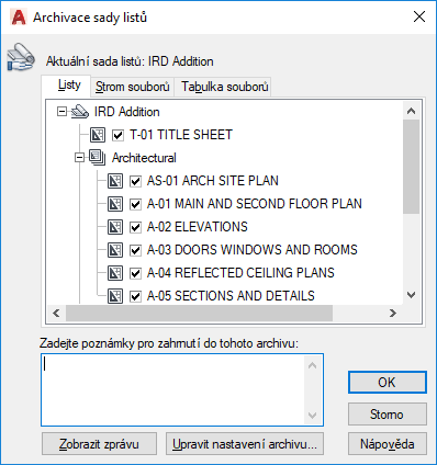 Obsahuje listy, které budou obsaženy v archivu v pořadí listů a podle uspořádání podsady. Je nutné, aby byl list otevřen ve Správci sady listů. Příkaz Archivace je možné zvolit v místní nabídce, která se zobrazí po kliknutí pravým tlačítkem myši na horní uzel sady listů, nebo je možno zadat příkaz ARCHIVUJ na příkazovém řádku.
