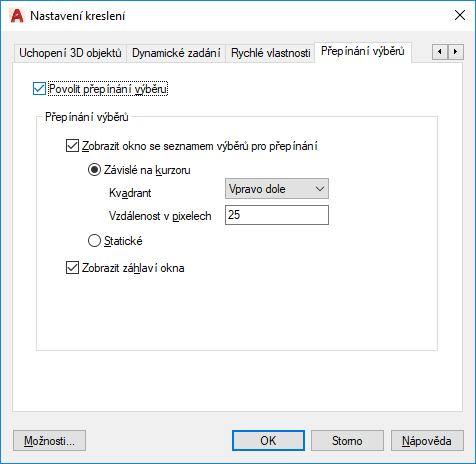 Určuje, zda je funkce Přepínání výběru zapnuta. (systémová proměnná SELECTIONCYCLING).