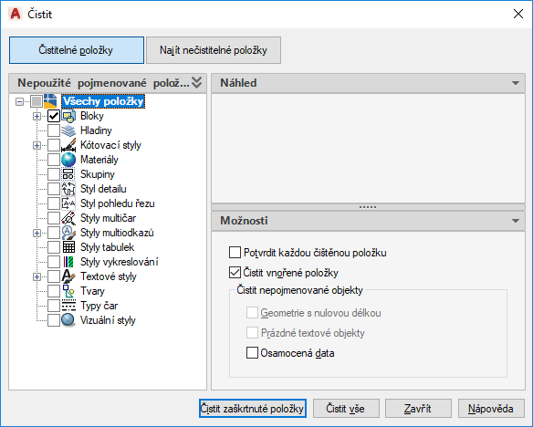 Odebere z výkresu nepoužité položky, například definice bloku a hladiny. Zobrazí položky, které je možné čistit a najde ve výkresu objekty, které není možné čistit.