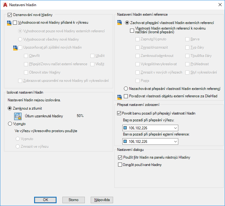 Řídí zobrazení přepsání vlastností hladiny externí reference v aktuálním výkresu.