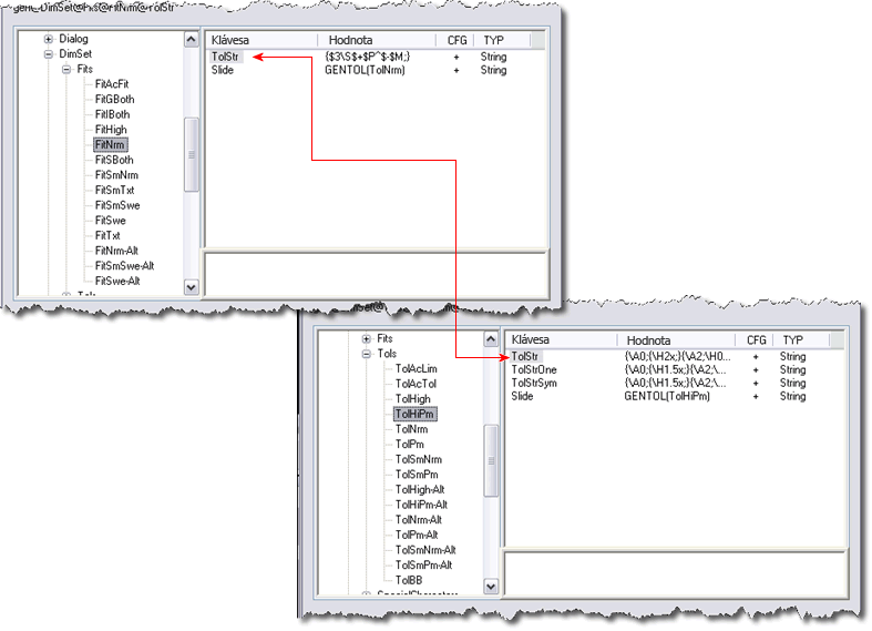 Klíče pro záznamy pod položkami „Fits“ a „Tols“ jsou stejné bez ohledu na to, zda se záznam týká lícování nebo tolerance.