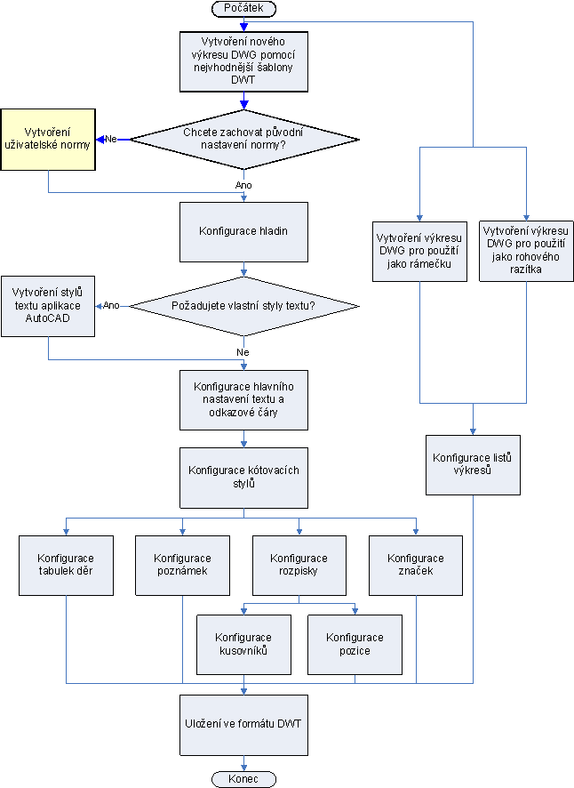 Společnost XYZ chce aplikaci AutoCAD Mechanical toolset použít v celém oddělení strojírenských návrhů. Společnost XYZ používá směrnice pro technické kreslení, které odpovídají normě ISO. Společnost však zavedla hladiny a barvy objektů, které norma nijak přísně neupravuje a které jsou odlišné od výchozích nastavení pro normu ISO obsažených v aplikaci AutoCAD Mechanical toolset. Proto se společnost rozhodla použít pozměněnou verzi normy ISO. Aby původní norma ISO zůstala zachována k referenčním účelům, vytvoří se uživatelsky definovaná norma s názvem „Společnost XYZ“ vycházející z normy ISO.