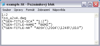 Standardní soubor importu (*.tit) je textový soubor obsahující údaje o rámečku výkresu a rohovém razítku, které lze importovat pomocí příkazu AMTITLE.