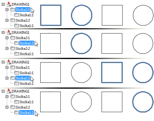 Zvažte Složku 1, která je vnořena do Složky 2:1. Tato instance je označena jako Složka 1:1. Složka 1:1 existuje zároveň pod Složkou 2:2. Je tomu tak proto, že Složka 1 je vnořena do Složky 2, a jakmile je vložena instance Složky 2, automaticky se vytvoří Složka 1. Dá se říci, že existují dva výskyty instance Složky 1.