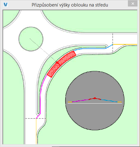 Diagram vlastností okružní křižovatky slouží k vysvětlení pojmů. Kliknutím na tlačítko Diagram jej zobrazíte a dalším kliknutím skryjete. Při klikání v různých polích se zobrazení diagramu mění podle vybraných parametrů.