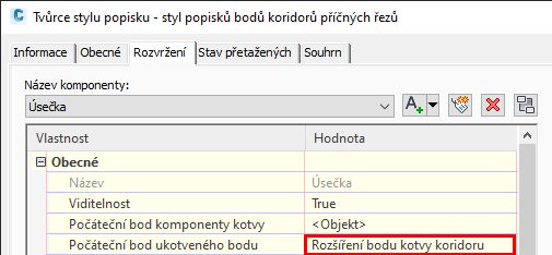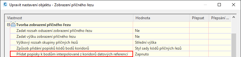 Další informace o tomto nastavení naleznete v části Dialog Upravit nastavení objektu – zobrazení příčného řezu. Další informace o opatřování bodů koridoru popisky naleznete v části Popisování kódů bodů koridoru v zobrazení příčného řezu.