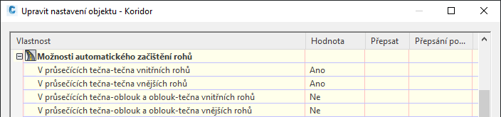 Pomocí těchto možností můžete nezávisle ovládat, zda budou vnitřní a vnější rohy koridorů s pevnou šířkou začištěny v průsečících tečna-tečna a v průsečících tečna-oblouk.