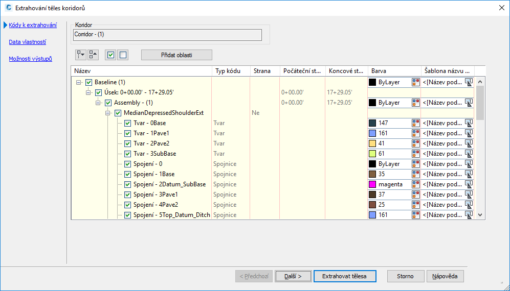 5. V průvodci Vytvořit tělesa z koridoru nastavte na stránce Kódy k extrahování následující možnosti: