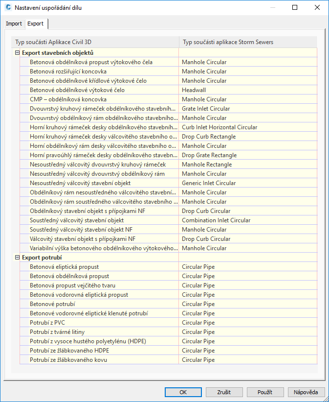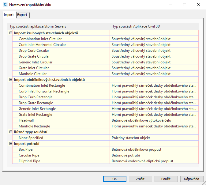 Karta Import umožňuje výběr rodiny součástí aplikace Autodesk Civil 3D (na pravé straně), které chcete použít u všech dostupných typů součástí rozšíření aplikace Storm Sewers. Typ součásti rozšíření aplikace Storm Sewers představuje pevný seznam. Toto mapování by mělo být rovno mapování exportu, aby rodiny součásti zůstaly stejné.