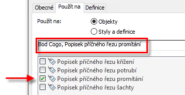 Pokud chcete do stylů popisků promítání zahrnout data sady vlastností, je nutné kromě typu objektu, jehož promítání se zobrazuje v zobrazení příčného řezu, vybrat ještě typ objektu Popisek příčného řezu promítání.
