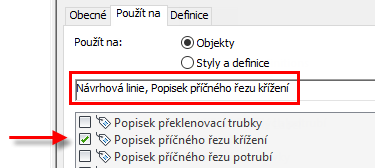 Chcete-li například v zobrazeních příčných řezů přidat popisky křížení návrhových linií s daty sady vlastností, vyberte při nastavování definice sady vlastností na kartě Použít na v dialogu Správce stylů položky Popisek příčného řezu křížení a Návrhová linie: