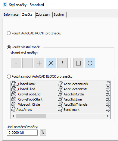 Styly značek lze nastavit tak, aby používaly body aplikace AutoCAD, vlastní symboly značek nebo bloky.