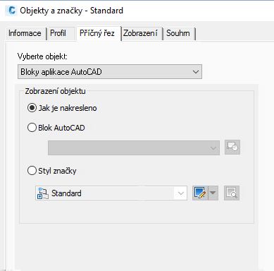Styly promítání na kartě Nastavení v Prostoru nástrojů. Nastavení zobrazení můžete pro zobrazení příčného řezu nakonfigurovat pomocí karty Příčný řez.