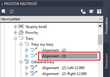 Automaticky se zobrazí a vybere stejná trasa v knihovně Trasy Osové trasy ve stromu Prospektoru. Tento příkaz slouží k rychlému vyhledání umístění protínající se trasy ve stromu Prospektoru.