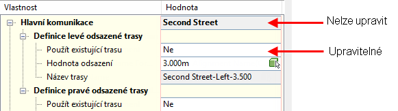 Označení objektu ve výkresu: když vyberete některé položky v dialogu úprav křižovatky, dotčený objekt se ve výkresu zvýrazní. Pokud například vyberete odsazení v dialogu Parametry odsazení křižovatky, ve výkresu se zvýrazní daná odsazená trasa. Toto chování je zobrazeno na následující ilustraci.