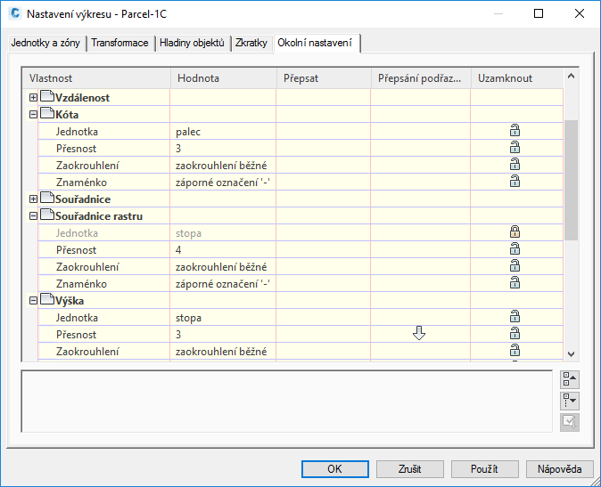 Na kartě Okolní nastavení je ve sloupci Přepsání podřízeného zobrazena šipka vedle každého nastavení, které je změněno pro jeden či více objektů ve výkresu. Tento přepis můžete zrušit klepnutím na šipku, a klepnutím na ikonu zámku lze zablokovat kterékoliv nastavení, zamezí se přepsání na úrovni objektu.