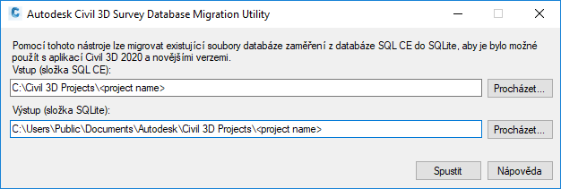 Nástroj Survey Database Migration Utility je samostatná aplikace ke stažení dostupná na stránkách https://knowledge.autodesk.com/support/autocad-civil-3d/downloads.