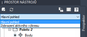 Okno Prostor nástrojů je integrální součástí uživatelského rozhraní umožňující přístup k příkazům, stylům a datům. Použijte jej k přístupu ke kartám Prospektor, Nastavení, Zaměření a Panel nástrojů. Chcete-li získat přístup k příkazům, klikněte pravým tlačítkem na každou kolekci nebo položku na těchto kartách.
