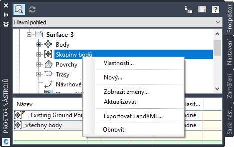 Karta Nastavení slouží ke správě nastavení objektů, stylů a dalších položek výkresu, například formátů souborů bodů, sad klíčů popisu a sad parametrů zemního tělesa.