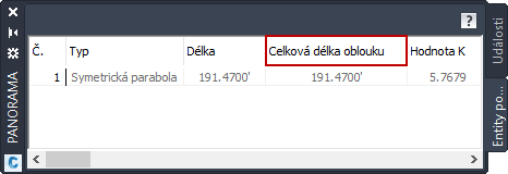 Použijte tento pohled k zobrazení a úpravám číselných dat o obloucích a tečnách v jednotlivých vrcholech výškového polygonu nebo pro určitou subentitu v profilu.
