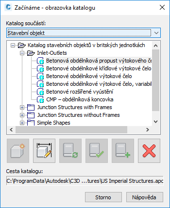 Z dialogu můžete pracovat s katalogem potrubí nebo stavebních objektů a procházet kategorie v rámci tohoto katalogu.