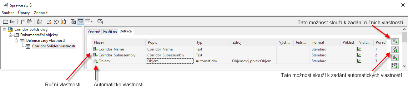 Vytvořte novou sadu vlastností a nastavte ruční a automatické vlastnosti, které chcete přiřadit k objektům.