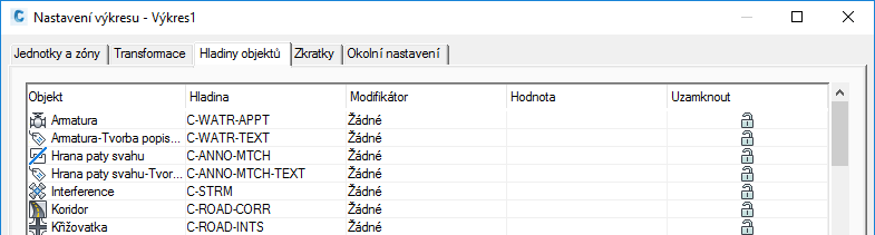 Hladina objektů se definuje v Nastavení výkresu anebo při vytváření. Hladiny komponent jsou definovány ve stylech objektů.