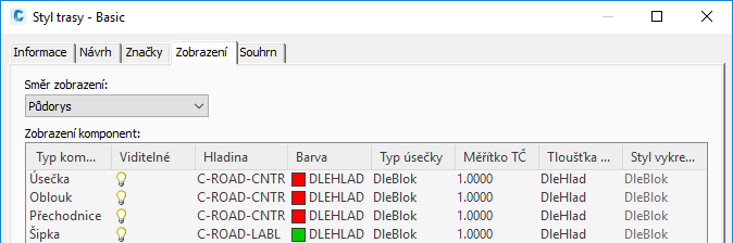Můžete určit hladiny komponent na kartě Zobrazení <objekt> dialogu Styl. V následujícím příkladu jsou zobrazeny hladiny používané pro komponenty tras: