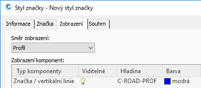 Styly značek slouží k ovládání vzhledu objektů křížení v zobrazeních profilů. Vzhled stylu značek se ovládá pomocí karty Zobrazení dialogu Styl značky. V seznamu Směr zobrazení vyberte profil a prohlédněte si nebo upravte styl značek, který je u zobrazení profilu konfigurován. Zobrazení značky (používané k zobrazení profilů křížení, návrhových linií, polygonů zaměření a 3D křivek) i zobrazení svislé čáry křížení (používané k zobrazení tras křížení) ovládá jediná komponenta.