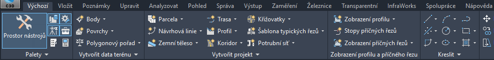 Pás karet aplikace Autodesk Civil 3D je primární uživatelské rozhraní poskytující přístup k příkazům a funkcím.