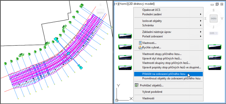 3. Klikněte pravým tlačítkem myši a vyberte příkaz Přiblížit na stopu příčného řezu nebo Přiblížit na zobrazení příčného řezu.
