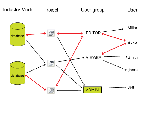 After installation, there is one default user, Administrator, who is a member of the ADMIN user group. For enterprise industry models only, you can create more user groups with different access rights, such as VIEWER and EDITOR. Create a user for each person who works with the enterprise industry model, such as Mr. Smith or Ms. Miller.