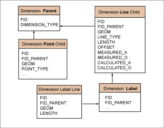 There are special feature classes to store dimensioning in the database. A dimensioning consists of several related feature classes. A dimensioning feature class (parent attribute feature class) is related to several child feature classes that store the geometry components, such as points (symbols) and lines, and labels.