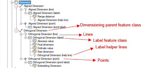 A dimensioning consists of several related feature classes. When you add the Dimension Extension to an industry model, the dimensioning feature classes are created, as shown in the following illustration.
