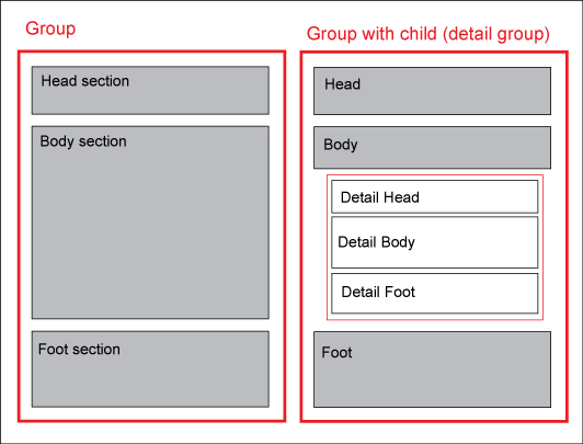 Report layout showing a group with head, body, and foot sections and a group with a child group
