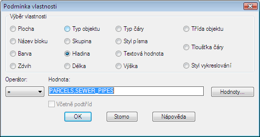 Vyberte možnost Hladina jako podmínku vlastnosti. Pouze objekty v hladině, kterou určíte, budou přidány do mapy.