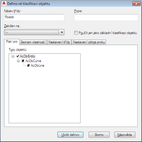 Chcete-li například změnit hladinu, typ čáry nebo barvu pro všechny členy třídy Cesty jako skupiny, vyberte tyto vlastnosti. Podle potřeby je možné nastavit výchozí hodnoty. Například všechny členy třídy Cesty můžete přiřadit k hladině Cesty.