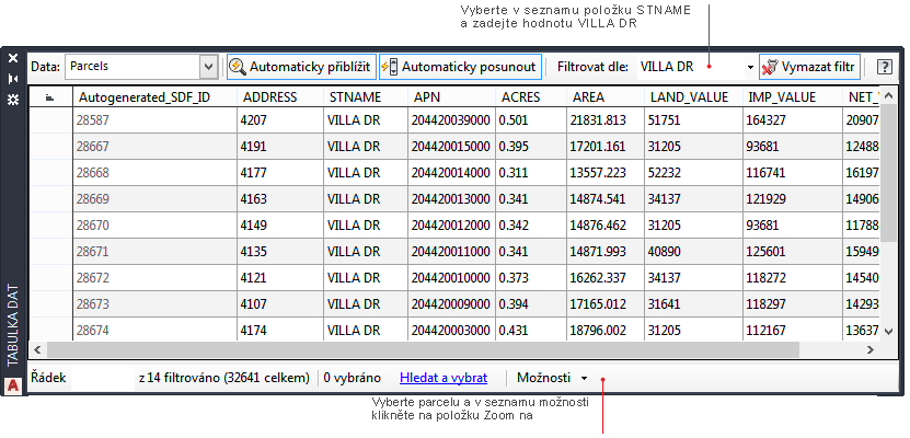 Zobrazení Tabulka dat ve všech hladinách. V okně Tabulka dat použijte filtr tak, aby se zobrazila jen určitá podmnožina parcel – v tomto případě jen parcely na Villa Drive.