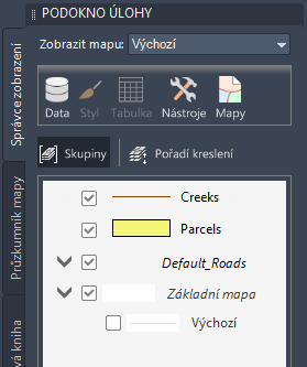 Karta Správce zobrazení zobrazuje hladiny na aktuální mapě.