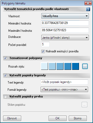 Téma mění zobrazení jednotlivých prvků podle hodnot dat. Například když použijete téma podle hodnoty parcely, levnější parcely mohou mít světlejší barvu, zatímco dražší tmavší odstín.