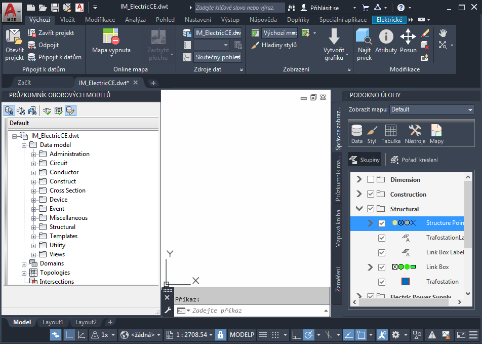 Výkres průmyslového modelu obsahuje průmyslový datový model. Průmyslové modely použijte, chcete-li zajistit, aby prvky, které vytvoříte, odpovídaly pravidlům a standardům, podobným klasifikovaným výkresovým datům . Průmyslové modely výkresu mají přístup k pokročilým funkcím, například formuláře třídy prvku, zprávy a nástroje pro analýzu. Další informace naleznete v části Oborové modely.