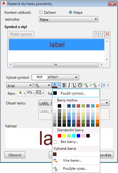 V tomto cvičení nastavíte styl hladiny textu – nastavíte tučné písmo a změníte jeho barvu. Dialog Textová hladina stylu obsahuje mnoho nastavení. Většina z nich je spojena se zdrojem dat prvků a neměli byste je měnit.