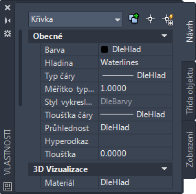 Silnice jsou objekty ve výkresu vytvořeném v programu AutoCAD. Aktuální výběr je definován jako Křivka. Pro objekty výkresu můžete formátovat určité vlastnosti pomocí palety Vlastnosti.