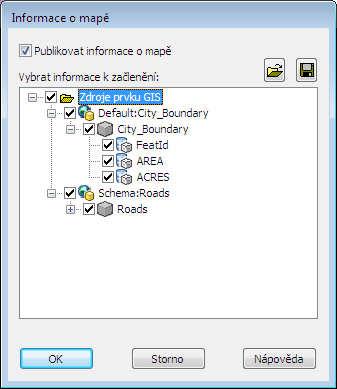Dialog Informace o mapě určuje, která data jsou publikována do DWF.