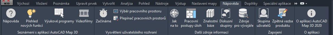 - Nápověda: Procházejte nebo prohledávejte koncepty a postupy, které pokrývají veškeré aspekty aplikace AutoCAD Map 3D toolset.