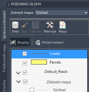 Karta Správce zobrazení zobrazuje hladiny na aktuální mapě.