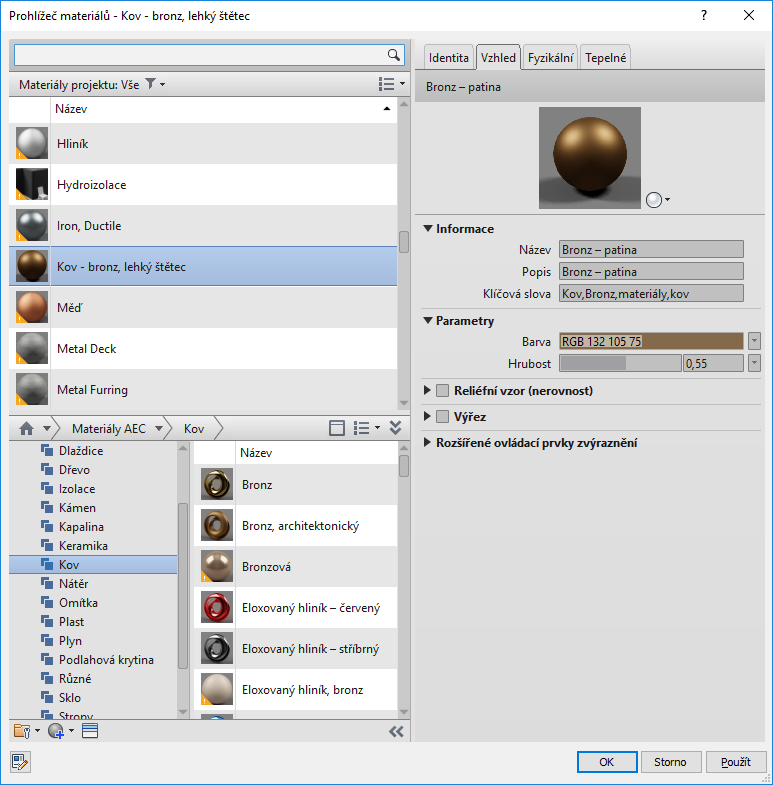 Dialog Prohlížeč materiálů použijte k vyhledání a správě materiálů pro prvky.