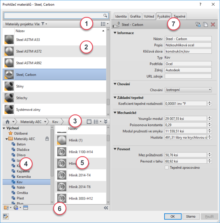| 7 | Když je materiál vybrán v seznamu knihovny (levé podokno), v pravém podokně se zobrazí karty (položky) asociované s tímto materiálem. Pohled na vlastnosti a položky materiálů zobrazíte kliknutím na karty (například Identita nebo Vzhled). Při zobrazení materiálů v knihovnách jsou vlastnosti určeny pouze ke čtení. |